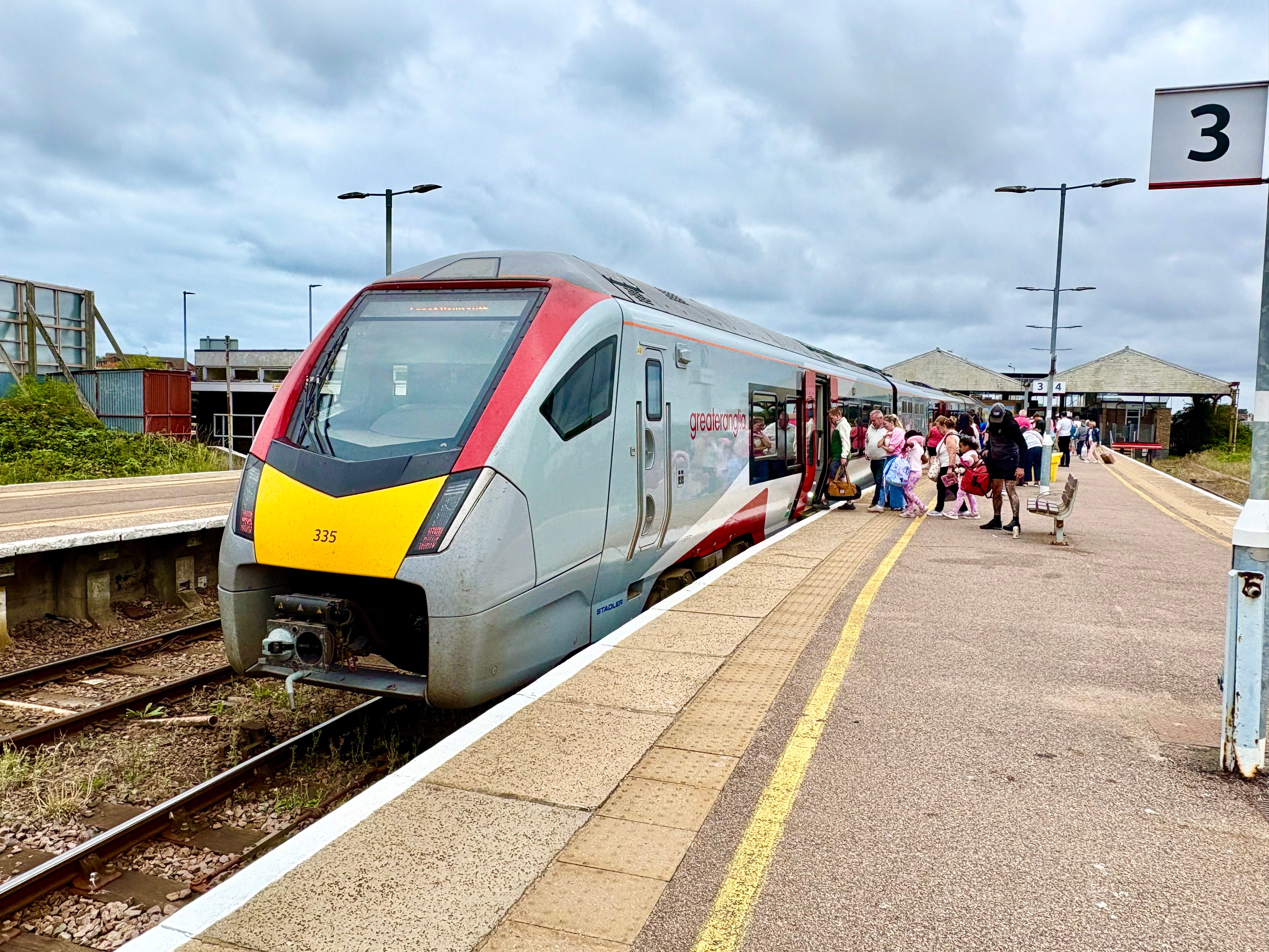 In rural Lincolnshire on an August Sunday, heading to Skegness can feel desperate—overcrowded trains and plentiful delays. The Norfolk equivalent, however, was calm and almost sedate. The Class 755 unit—with a “power‑pack” central car rather than an engine beneath your feet—made for a quieter, more pleasant ride. The kids called it the “engine coach”, but it’s properly known as the power-pack. We reached a grey Great Yarmouth exactly on time.